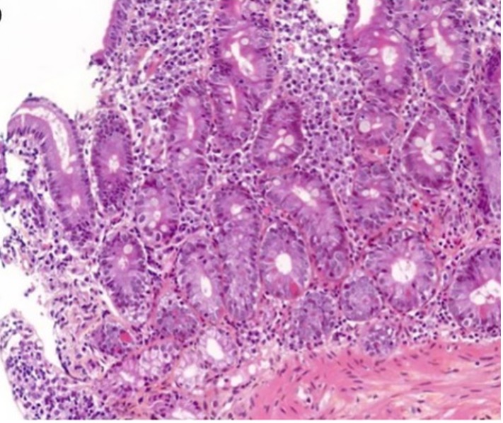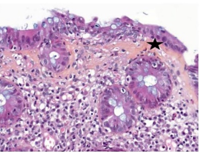 - Signes de chronicité de plus en plus décrits, caractérisés par un certain degré de distorsion des cryptes, un infiltrat lymphoplasmocytaire basal, une augmentation des cellules de Paneth.