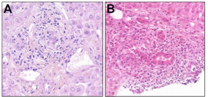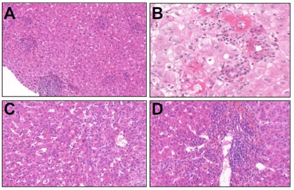 Comme illustré par la figure 3, les hépatites lobulaires présentent une nécrose ponctuée, un infiltrat lymphocytaire et histiocytaire, surtout intrasinusoïdal, et un infiltrat portal avec une discrète activité périportale et une endothélite veineuse portale. Pas ou peu de plasmocytes. Elles ne ressemblent pas à des hépatites auto-immunes et sont composées principalement de lymphocytes CD8+ CD4+.
