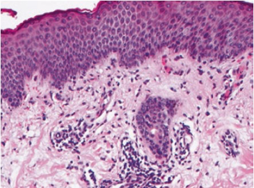 Le rash maculopapuleux constitue l’un des IrAE cutané fréquemment observé. L’aspect histopathologique le plus fréquent est eczématiforme avec une dermatose spongiotique, une exocytose lymphocytaire, un infiltrat périvasculaire T superficiel et quelques éosinophiles [Figure 5].