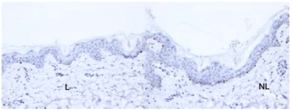 Immunomarquage vitiligo-MART1 dans la peau lésionnelle (L) montrant une diminution des mélanocytes à la jonction dermo-épidermique comparé à l’immunomarquage MART1 de la peau non lésionnelle (NL)