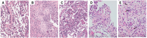 L’aspect le plus fréquemment décrit est un infiltrat inflammatoire interstitiel, le plus souvent lymphocytaire, mais pouvant également comporter un certain nombre de polynucléaires éosinophiles. Cet infiltrat est, de façon non-exceptionnelle, accompagné de petits granulomes épithélioïdes gigantocellulaires non nécrotiques (parfois seulement des ébauches de granulomes) semblables aux lésions décrites dans les pneumopathies d’hypersensibilités.