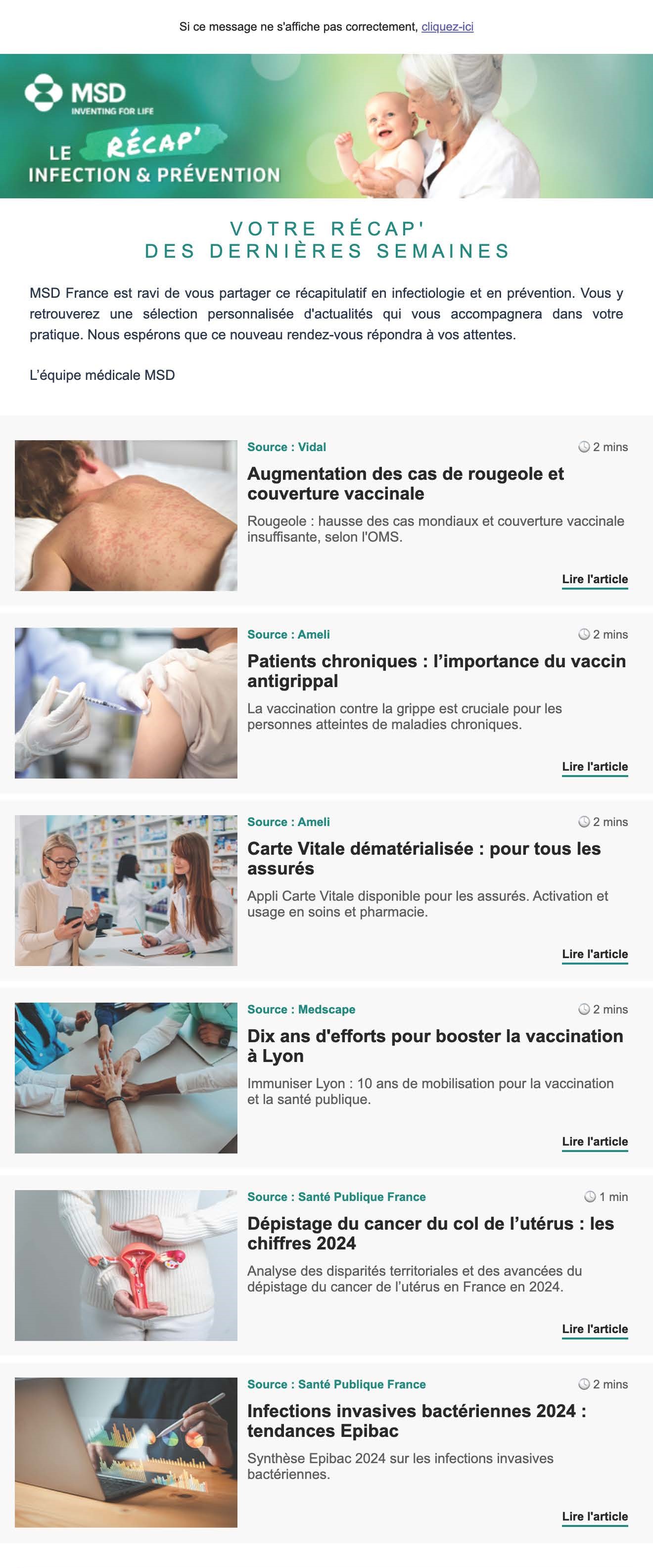 Chaque mois, recevez gratuitement une sélection claire et fiable des actualités en infectiologie, prévention et vaccination, adaptée à votre spécialité.